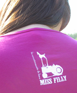 ‘Miss Accoutrements de Barn’ featured in white on a raspberry 100% cotton jersey long sleeve…