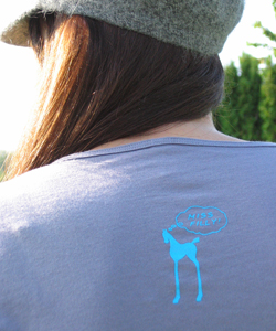 ‘Miss Lichtenstein’ featured in bright yellow on a slate grey 100% cotton jersey long sleeve with graphic in peacock blue on back…